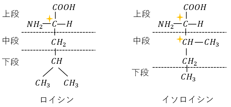 - 覚え方;ロイシンよりも分岐を「急ロイシン(中段で分岐)」