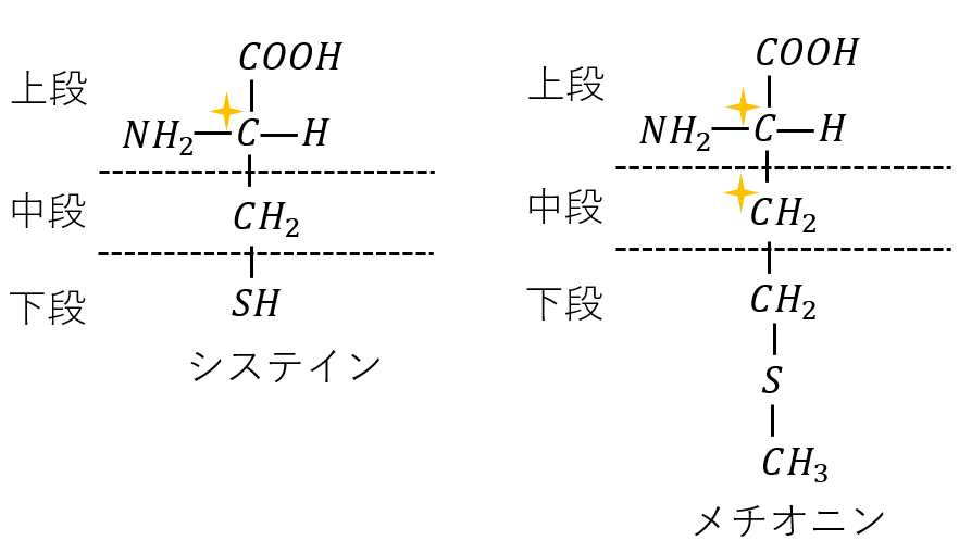 - 覚え方;システインよりも下段が「めっちゃ」長いからメチオニン