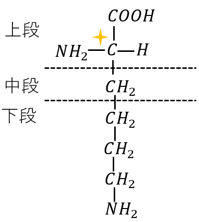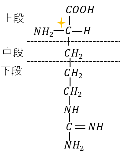 - 覚え方;リシンの中段でCH2の代わりにNHが、追加でC=NHがアルギニン