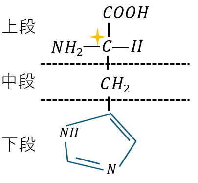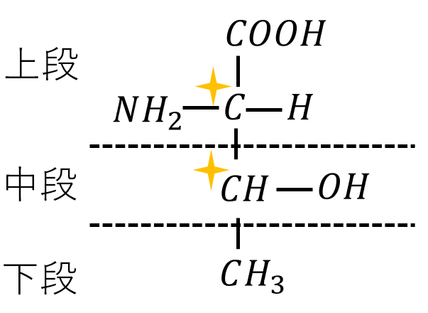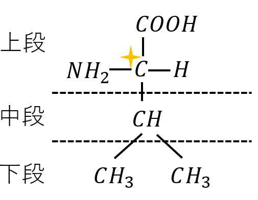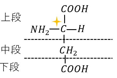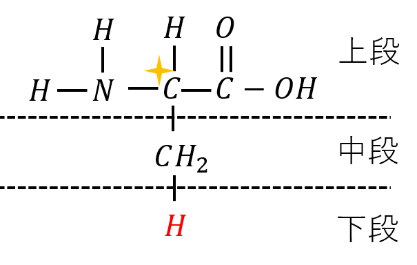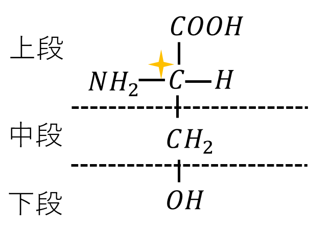 アラニンは上段・中段・下段を持つアミノ酸の中で最も簡単な構造です。
