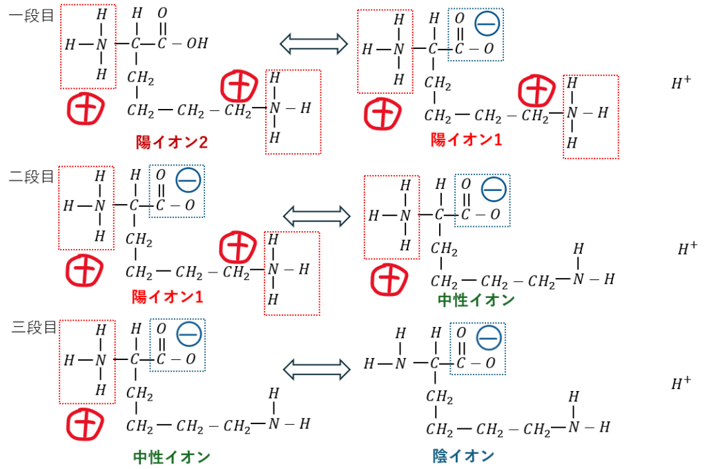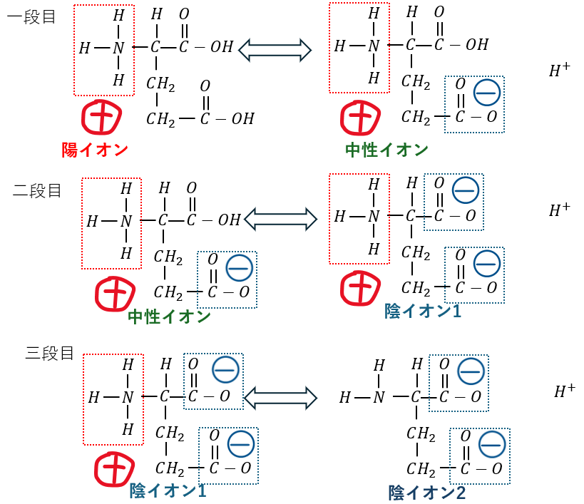 電離は三段階あります(図ではアスパラギン酸を例に解説)。