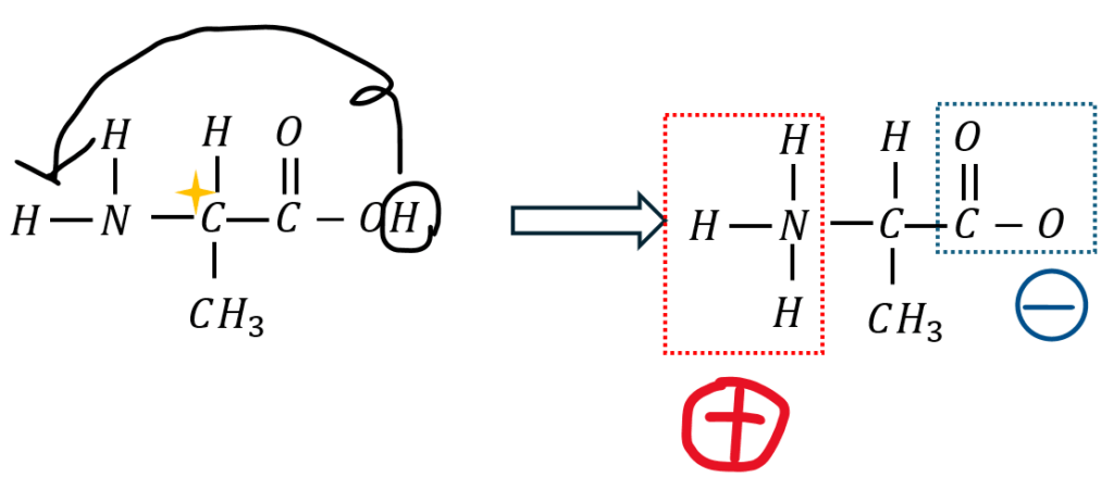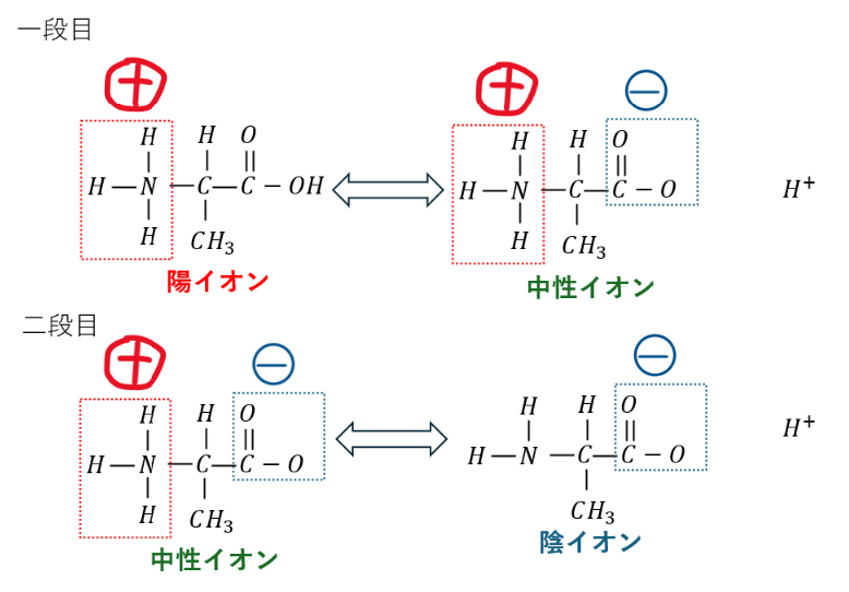 電離は二段階あります(図ではアラニンを例に解説します)。