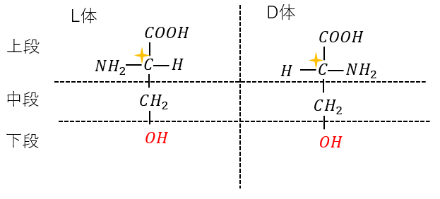L体とD体というのは単純に立体構造を区別するだけのモノであって、旋光の方向を決める訳ではないことは覚えといてください。