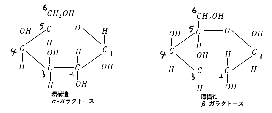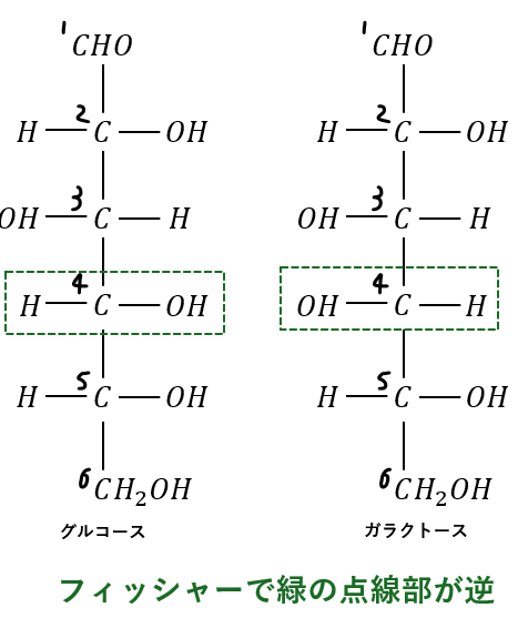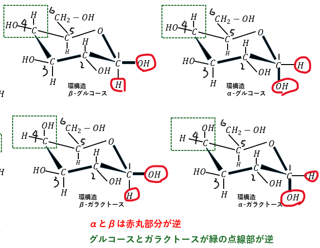 そのため、グルコースの構造さえ頭に入れておけばガラクトースの構造は書けます。