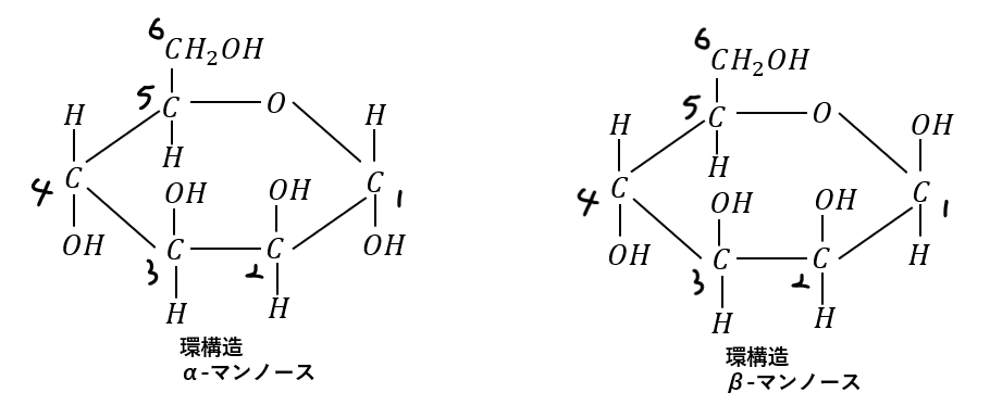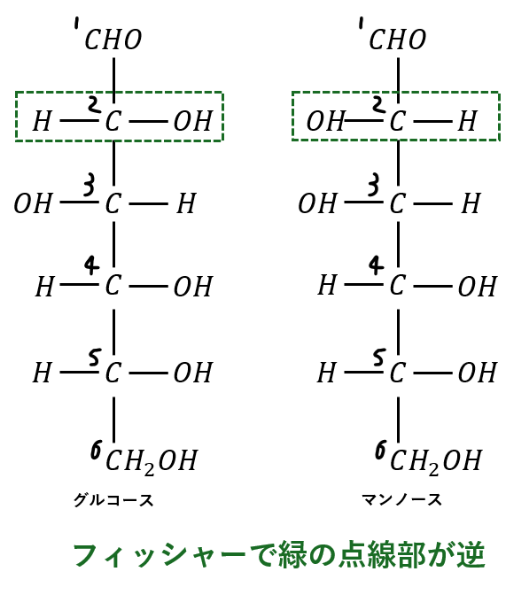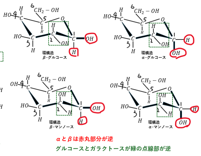 そのため、グルコースの構造さえ頭に入れておけばマンノースの構造は書けます。