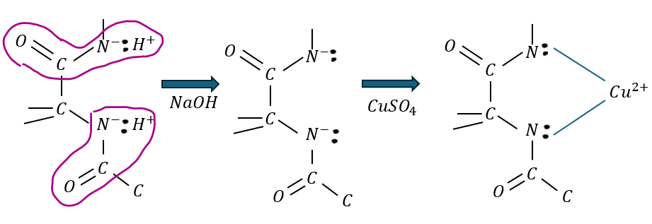 ビウレット反応とはペプチド結合を2つ以上持った化合物にNaOH水とCuSO4水を加えると赤紫色になるという現象が起きます。