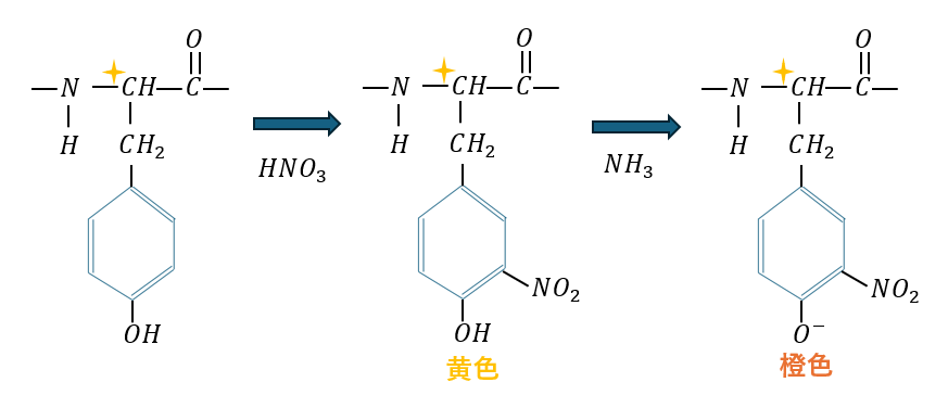 これはベンゼン環を持つアミノ酸を特定するための反応です。