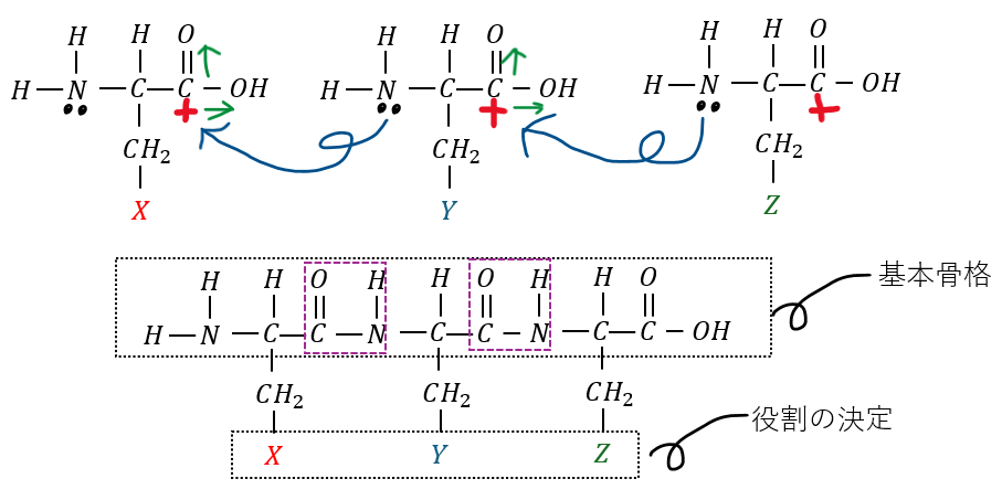 図の紫色の実践で囲まれた部分がペプチド結合です。順を追って説明します。