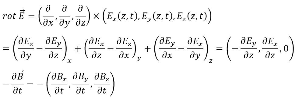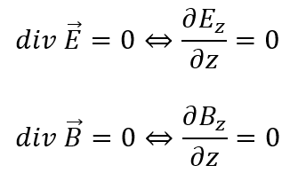 上の式ですが、電場と磁束密度のx,y,z方向も位置zの関数によって決定されるのでdivのx,y成分は当然0になります(当たり前)。