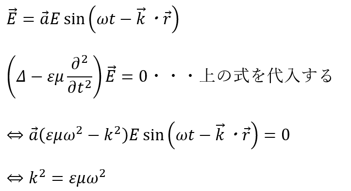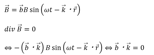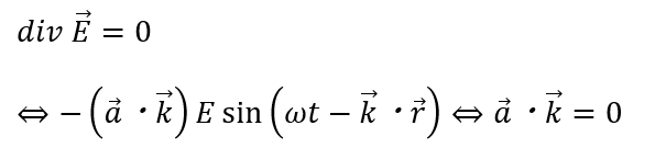 上の式の意味することは波の進行方向(ベクトルk)について電波の方向(ベクトルa)は垂直であるという点です。