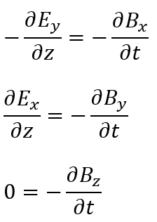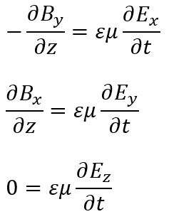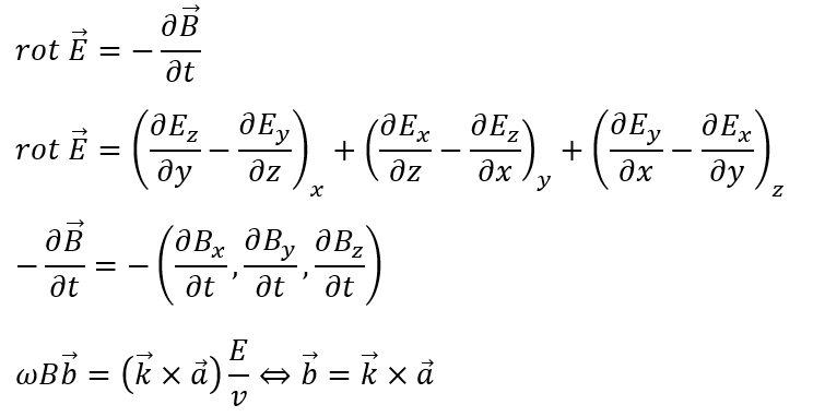 上の式が意味するところは磁場の進行方向が電場の進行方向と波の進行方向の外積を取った方向にあると言うことです(外積の記事で右ネジが空間的に進む方向と考えると・・・)。