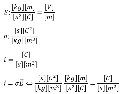 求めた式はある意味でオームの法則であるとも言えます。念のため、次元検算も行います。