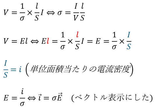 この中で、3番目に出てくる単位面積当たりの電流密度と電場の関係式は見たことがないので解説します。