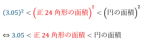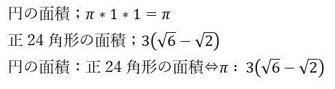 円に内接しているので「正多角形の面積 < 円の面積」になります。