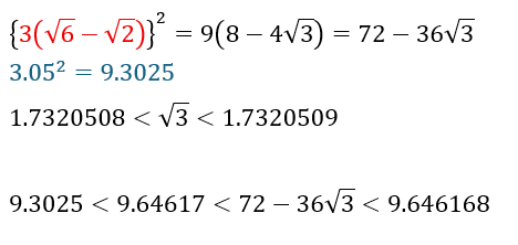 以上のことから3(√6-√2)が3.05よりも大きいことを示せれば勝ちです。