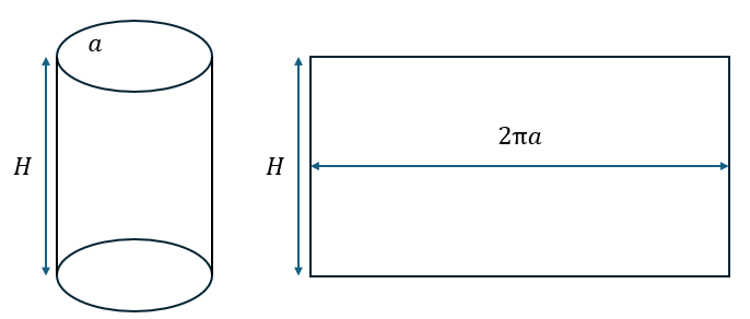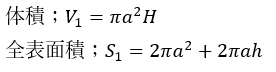 小学校で習った知識ですが円柱の体積や表面積について求めておきます。