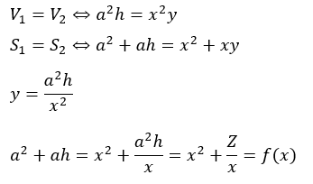 これを全表面積の式に代入することでxに関する二次方程式が完成します。