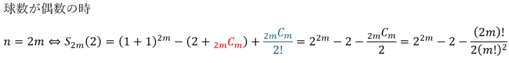 - 赤い部分;m個とm個に分けられる場合の数を一旦全部引いてる