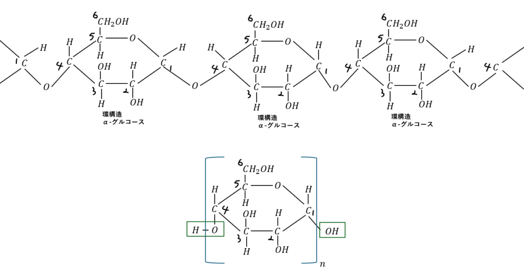 アミロースはα-グルコースの1位と4位のOHが縮合したデンプンの一形態です。