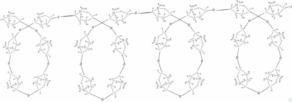 - アミロペクチン・・・線状螺旋構造をもちながら枝分かれ構造も持つデンプン