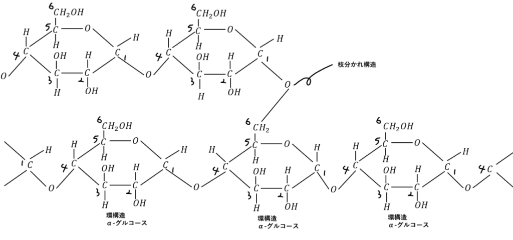 ちなみに、デンプンのもう一つの形態としてグリコーゲンという形態もありますが、これは、アミロペクチンと同様に枝分かれ構造を持ちます。
