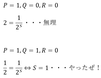 そのため、「R=0」「P=1」になるしか左辺が奇数になる道は残されていません。