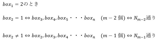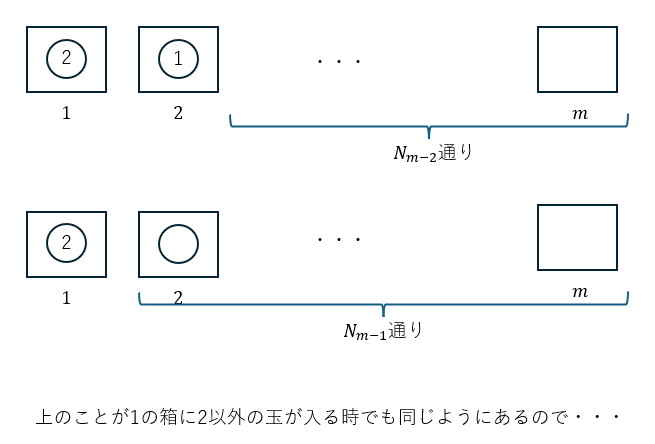 これが①と書かれた箱に3,4,・・・mと書かれた玉が入る場合も同様のことが起きるので・・・