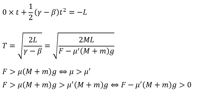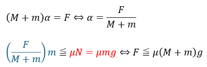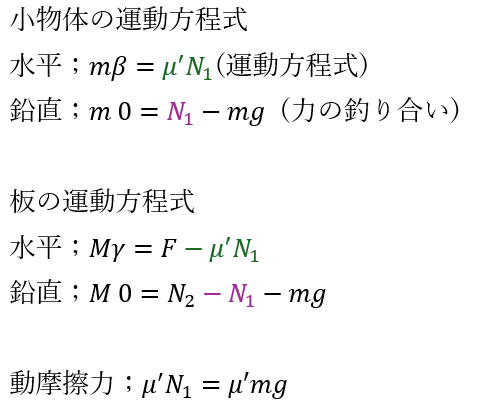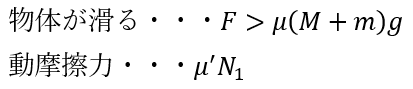 • ②;求めた加速度で小物体の運動方程式→最大摩擦力を考える