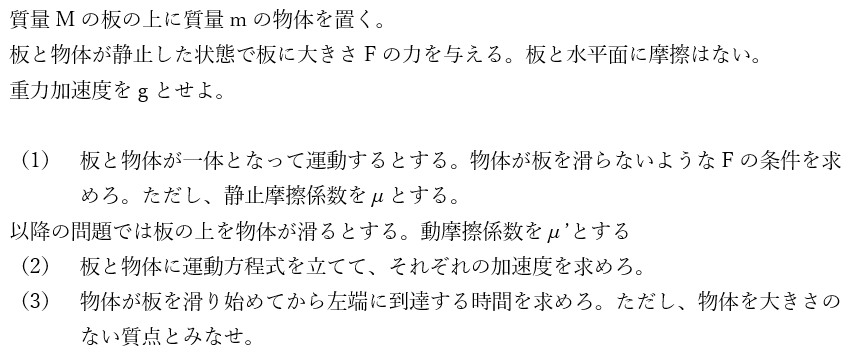 (3)については、t=0sで物体は右端にあるとしてください。また、板の長さをLとします。