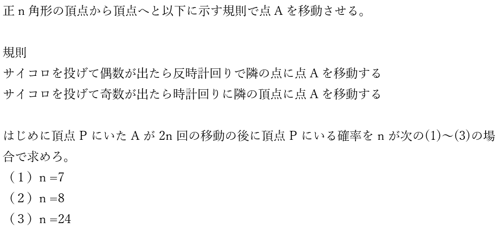 確率の記事で正多角形がかかわる問題や数直線上を動く点に関する問題に関しては解説したと思います。