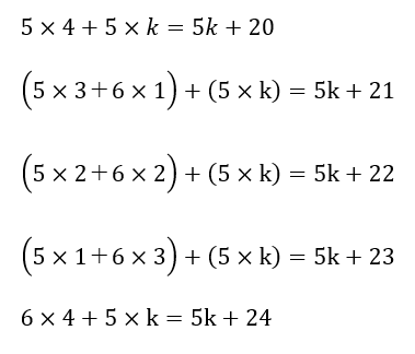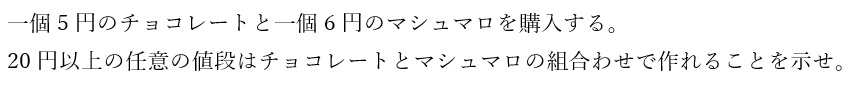 この問題は5円のチョコと6円のマシュマロの組合わせにおいて「最低額を20円として、21~24円を作ることができるか?」と言い換えることが出来ます。