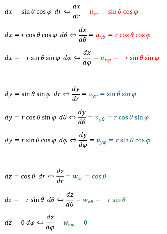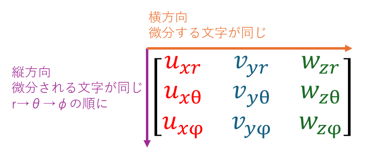 xとyとzをそれぞれr,θ,φで微分すると9つの項が出てきます。