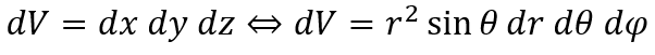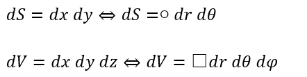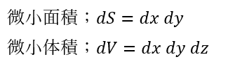微小面積や微小体積を直交座標で表すと以下のようになります。