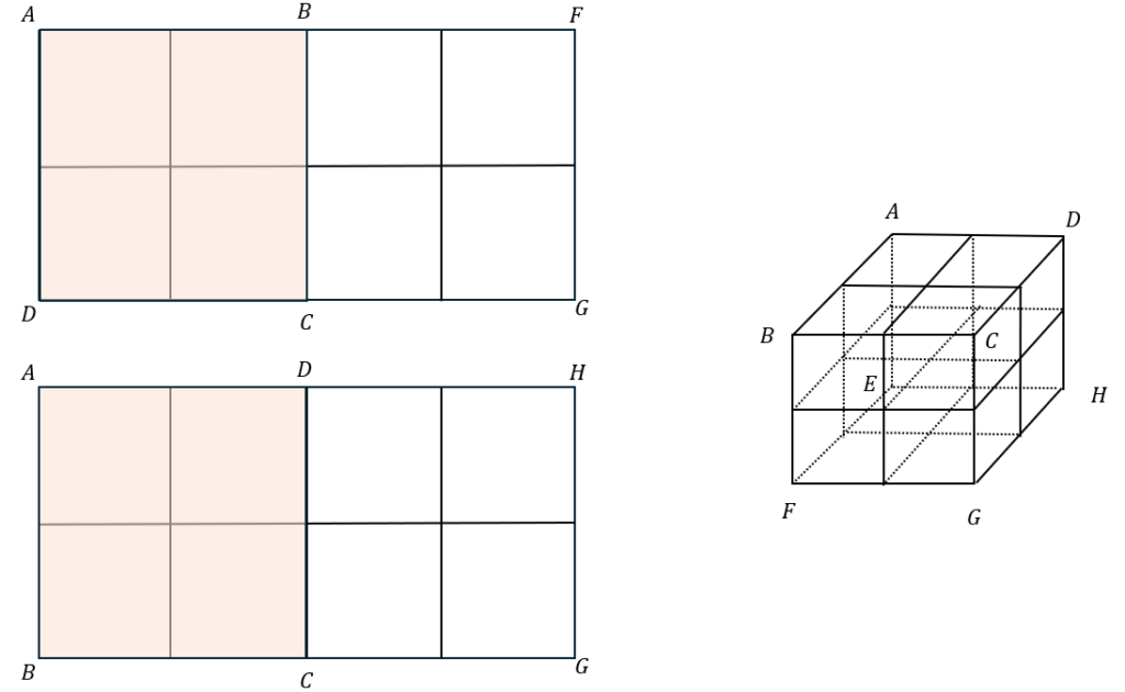 どちらの展開図もオレンジ色の部分は同じ面になります。だからG→C→Aまでの6通りは重複しているのです(ダブルカウント)。