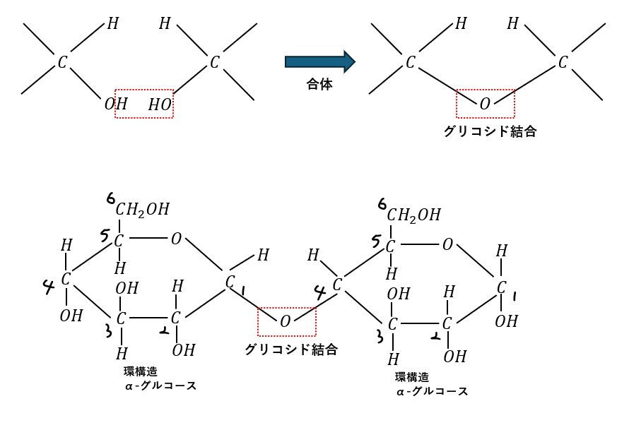 糖が縮合してつなぎ目に出来る「-O-」の結合のことをグリコシド結合と言います。