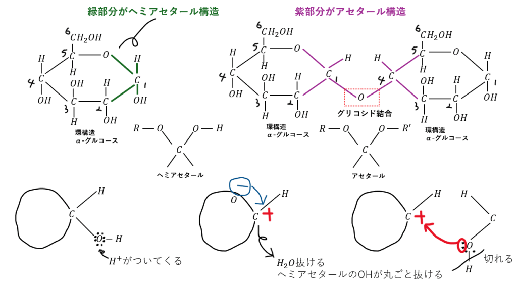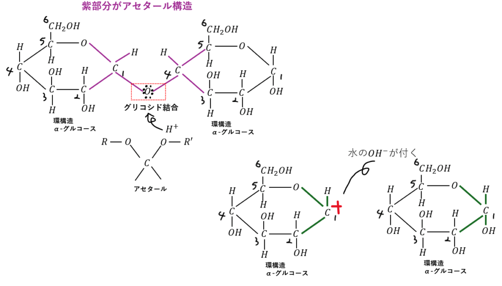 - Hイオンがグリコシド結合のOに近づく (Hイオンは希硫酸や酵素から供給)
