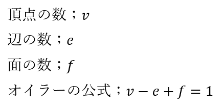 簡単に説明すると、立体の頂点・辺・面の数に関する定理のことで、この定理を正多面体に拡張すると「正多面体の個数は有限個」という結論を導き出すことが可能です。