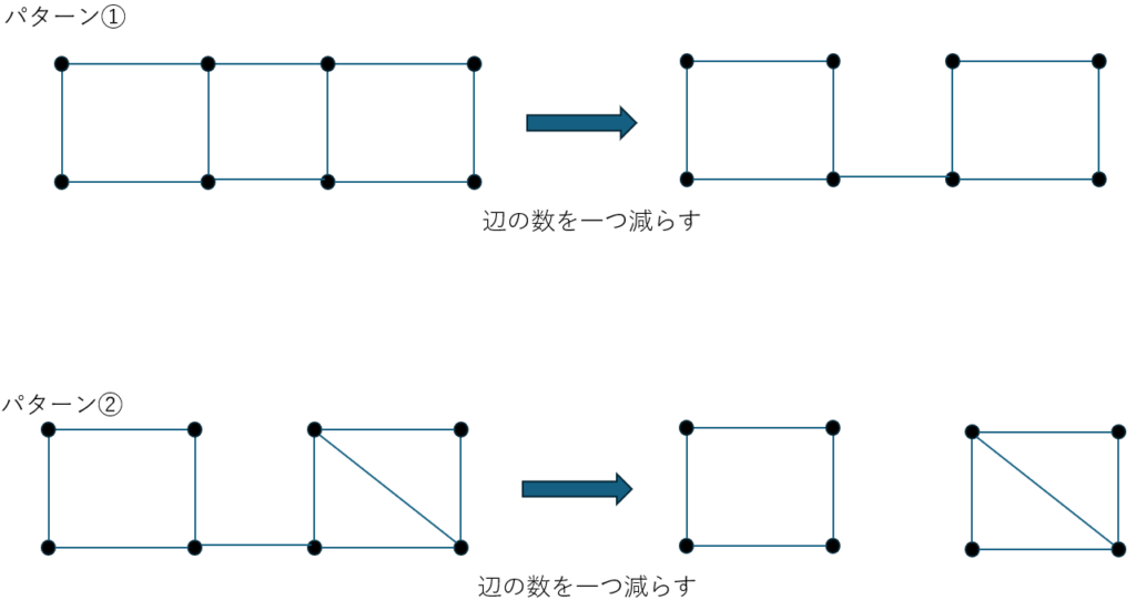 - パターン②;辺の数を減らして二つの連結グラフに分かれる
