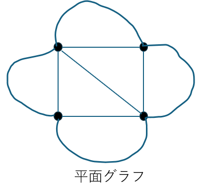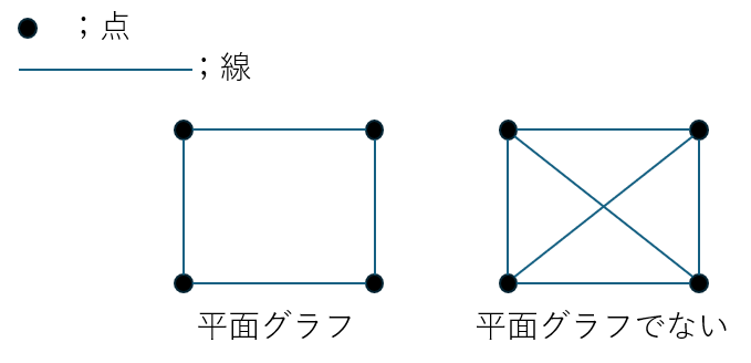 平面グラフとは「平面上の点(有限個)を結ぶことでできる線が交わらない図形」のことです。