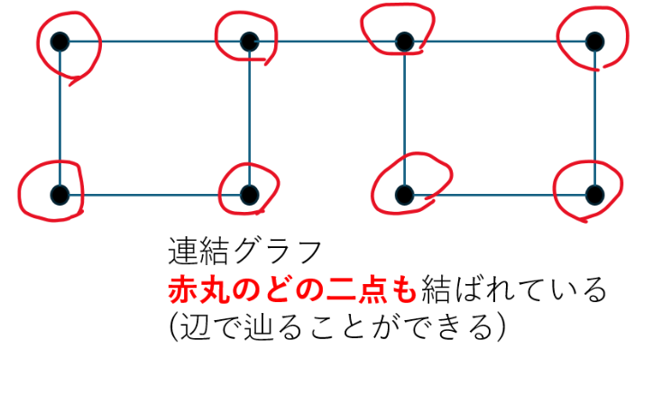 上のグラフで赤丸の点はどの二点をとっても辺で辿ることが可能です。