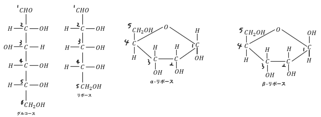 単糖の構造が書けないと言う人は、まず、グルコースの構造を覚えてください。