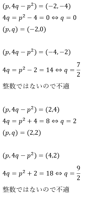 - pが偶数なら(4q-p^2)も偶数 (偶数-偶数)