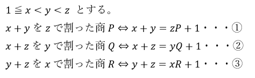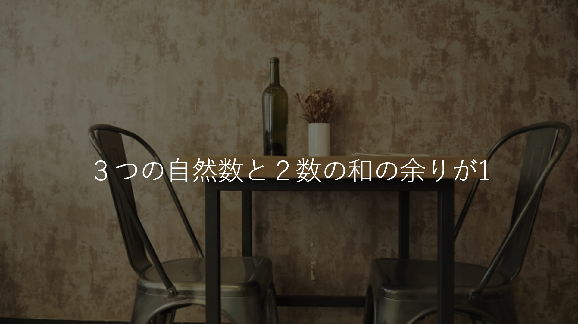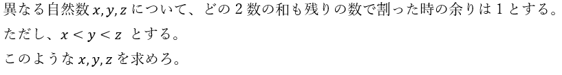 今回の記事では3つの自然数について、2数の和を残りの数で割った余りが1になる問題について解説します。