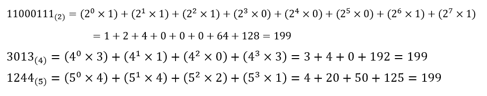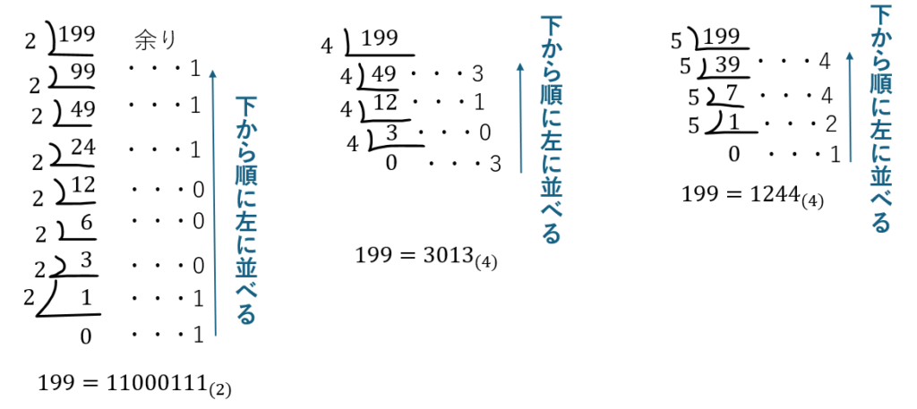 例えばですが、10進法で199と表されている数を2進法・4進法・5進法で表してみます。