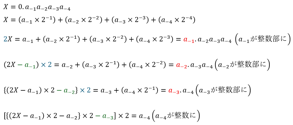 上に示すように2進数の場合、2を小数に掛けた結果の整数部を評価することで小数部の数字を導出します。