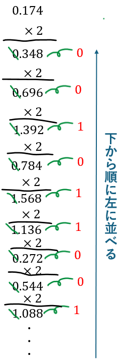 10進数で0.174と表されている数を2進法で途中まで表してみます。