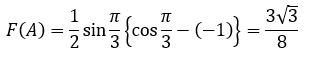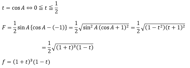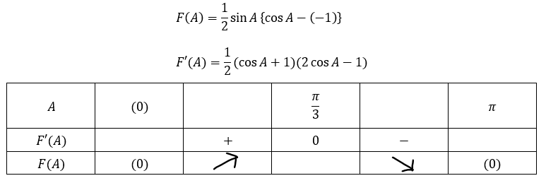 以上から最大値は角Aが60°になるときで、このとき、角Bも60°になるのでABCが正三角形になるときに最大値を取ります。